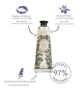 Une crème pour les mains format voyage, facile à glisser dans son sac à main ou à emporter partout pour des mains douces et hydratées en toutes circonstances. ✔️ 97% d’ingrédients d’origine naturelle✔️ Parfume délicatement les mains✔️ Packaging recyclable✔️ Vegan friendly✔️ Crème mains Fabriquée en France✔️ A base de beurre de karité Lavande Apaisante HUILE…
