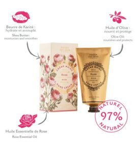 Enriched with shea butter and endowed with an ultra-nourishing texture, this moisturizing rose hand cream combines the nourishing benefits of olive oil with the natural scents of essential oils. ✔️ 97% naturally-sourced ingredients✔️ Delicately perfumes hands✔️ Recyclable packaging and recycled✔️ Vegan hand cream friendly✔️ Made in France✔️ Based on Shea Butter Rejuvenating Rose ROSE ESSENTIAL OIL The rose, symbol of…