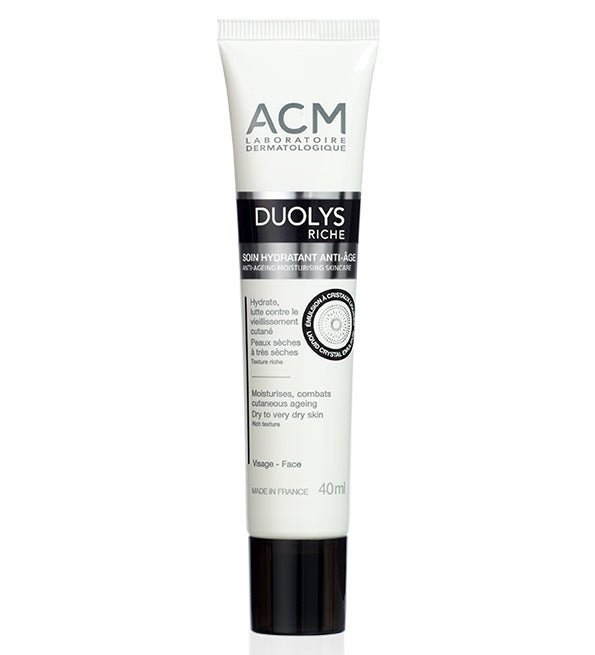 ACM Duolys Riche Soin Hydratant Anti-âge 40ml .CE SOIN LUTTE CONTRE LE VIEILLISSEMENT CUTANÉ EN RENFORÇANT L’HYDRATATION DES PEAUX SÈCHES À TRÈS SÈCHES. La déshydratation est une cause importante du vieillissement de la peau, notamment des peaux sèches qui ont tendance à se rider plus vite. Grâce à Duolys riche la peau retrouve son taux d’hydratation idéale, ce qui la rend plus ferme, plus lumineuse et plus douce. Il s’agit d’une émulsion à cristaux liquides qui favorise une meilleure pénétration des actifs hydratants.