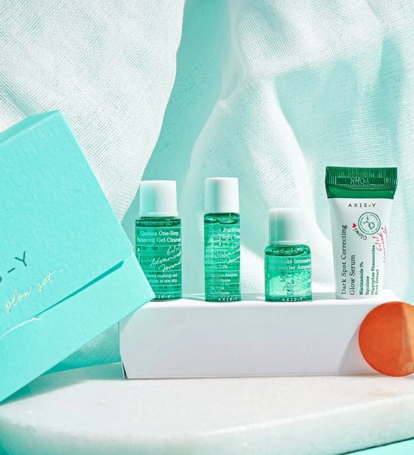 AXIS-Y The Mini Glow Set est l’ensemble idéal pour tous ceux qui souhaitent essayer les produits d’AXIS-Y. Ce coffret contient un mini Nettoyant Quinoa 8 ml, un mini Tonique Purifiant 5 ml, une mini Ampoule Artichaut 5 ml et un mini Sérum Éclat Incroyable Anti-Taches 5 ml.