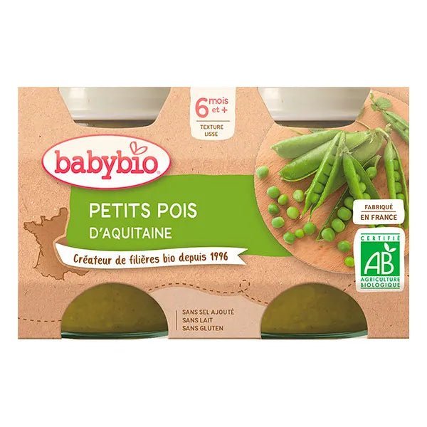 Les petits pots aux petits pois d’Aquitaine de la marque Babybio pour l’éveil de bébé aux saveurs naturelles et son bon équilibre nutritionnel. 2 x 130g.