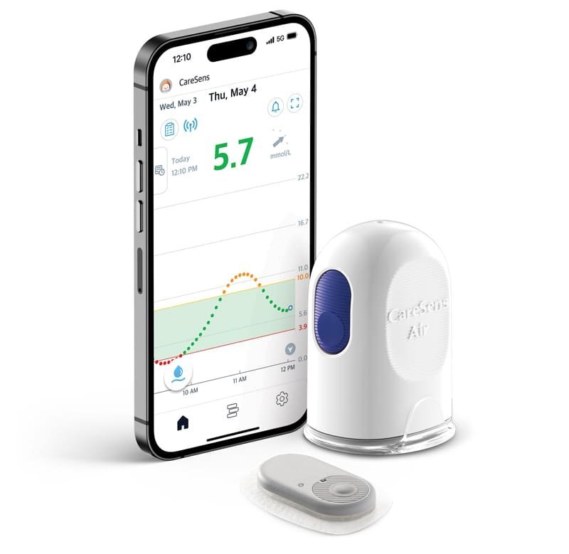 La confiance à tout moment grâce au système CGM en temps réel CareSens Air . Prenez un meilleur contrôle de votre diabète grâce à un capteur CGM de 15 jours vraiment simple et précis. CareSens Air envoie des mesures de glycémie en temps réel à votre appareil mobile toutes les 5 minutes. Le système de surveillance continue du glucose (CGMS) est une méthode qui mesure en continu les niveaux de glucose dans le liquide interstitiel et fournit à l’utilisateur des données et des tendances concernant les changements dans les niveaux de glucose. Quel est l’avantage du système CGM en temps réel CareSens Air ? Plus besoin de mesurer avec des bandelettes de test et des lancettes. Recevez automatiquement vos résultats grâce à l’application Freestyle Libre Link. Un capteur dure 15 jours. Le capteur doit être calibré quotidiennement au moyen d’une piqûre au doigt.