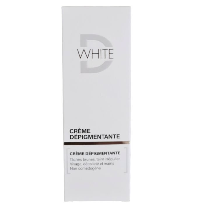 La formule de la crème D-white contient de l’acide kojique, un ingrédient actif éclaircissant, ainsi que de l’acide glycolique et de la vitamine C pour exfolier la peau et éliminer les cellules mortes. Elle également enrichie en beurre de karité pour nourrir la peau et en extrait d’aloès pour apaiser et hydrater.