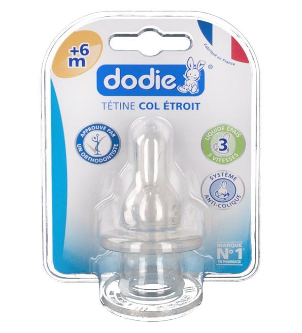 La tétine Dodie liquides épais au col étroit est conçue pour faciliter l’absorption de liquides épais