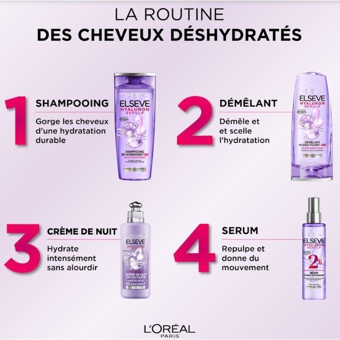 Le Elseve Hyaluron Repulp Shampooing Hydratation 72H de L’Oréal Paris est conçu pour redonner vie aux cheveux déshydratés et ternes. Formulé avec de l’acide hyaluronique, un actif dermatologique reconnu pour sa capacité à retenir jusqu’à 1000 fois son poids en eau, il hydrate intensément la fibre capillaire tout en la légèreté.