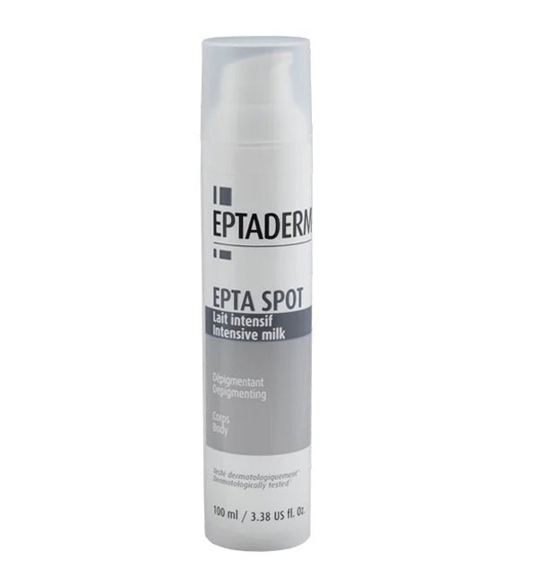 EPTA SPOT LAIT Dépigmentant Intensif est un traitement spécifique pour les désordres pigmentaires du corps et du visage. Sa formule complète et innovante, qui combine des actifs hydratants naturels associés aux complexes d’actifs dépigmentants, a une action exfoliante et blanchissante, qui favorise l’élimination des tâches brunes déjà installées et une action hydratante, qui nourrit la peau en profondeur. EPTA SPOT LAIT Dépigmentant Intensif redonne à votre peau souplesse, éclat et blancheur.