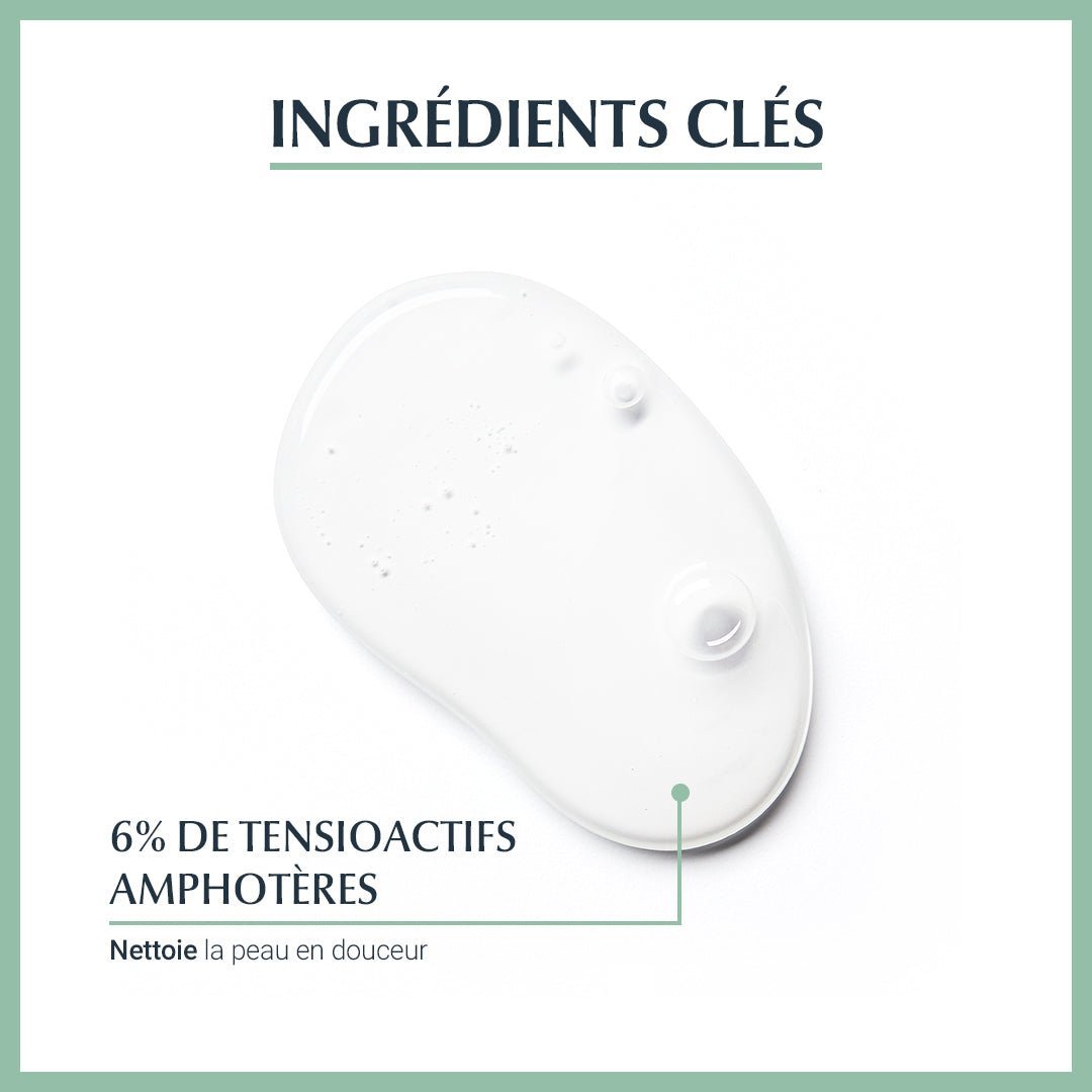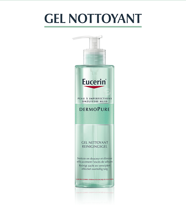 EUCERIN DermoPure Gel Nettoyant élimine efficacement et en douceur l’excès de sébum, tout en enlevant les impuretés et le maquillage, grâce à sa formule sans savon avec 6% de Tensioactifs Amphotères. La peau du visage est propre, fraîche et souple. Non-comédogène.