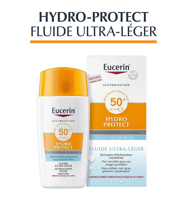La lumière UV est la principale cause de dommages cutanés induits par le soleil, mais la lumière visible à haute énergie (HEV) peut également induire des radicaux libres qui causent un stress supplémentaire à la peau. Le Fluide Ultra-léger Sun Visage Hydro Protect Eucerin SPF 50+ est un écran solaire quotidien qui contient le complexe Hydro-Tech pour une hydratation immédiate et une sensation de fraîcheur sur la peau, et qui protège contre les dommages cutanés induits par le soleil. L’Advanced Spectral Technology combine des filtres UVA et UVB à large spectre et photostables1 pour une protection UV très élevée, avec de la Licochalcone A pour neutraliser les radicaux libres causés par les UV et la lumière HEV. Le fluide solaire contient également de l’Acide Glycyrrhétinique qui soutient le mécanisme naturel de réparation de l’ADN de la peau. Avec sa formule parfumée, ultra-légère et non grasse, le Fluide Ultra-léger Sun Visage Hydro Protect Eucerin SPF 50+ est absorbé rapidement et ne laisse aucun résidu après application. Il est cliniquement et dermatologiquement très bien toléré par tous les types de peaux, même les peaux sensibles.