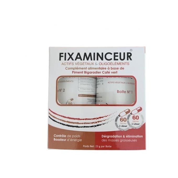 Le complement alimentaires fixaminceur gelules est une presentation de deux boites avec des formulations a actions complementaires pour favoriser un effet minceur efficace
