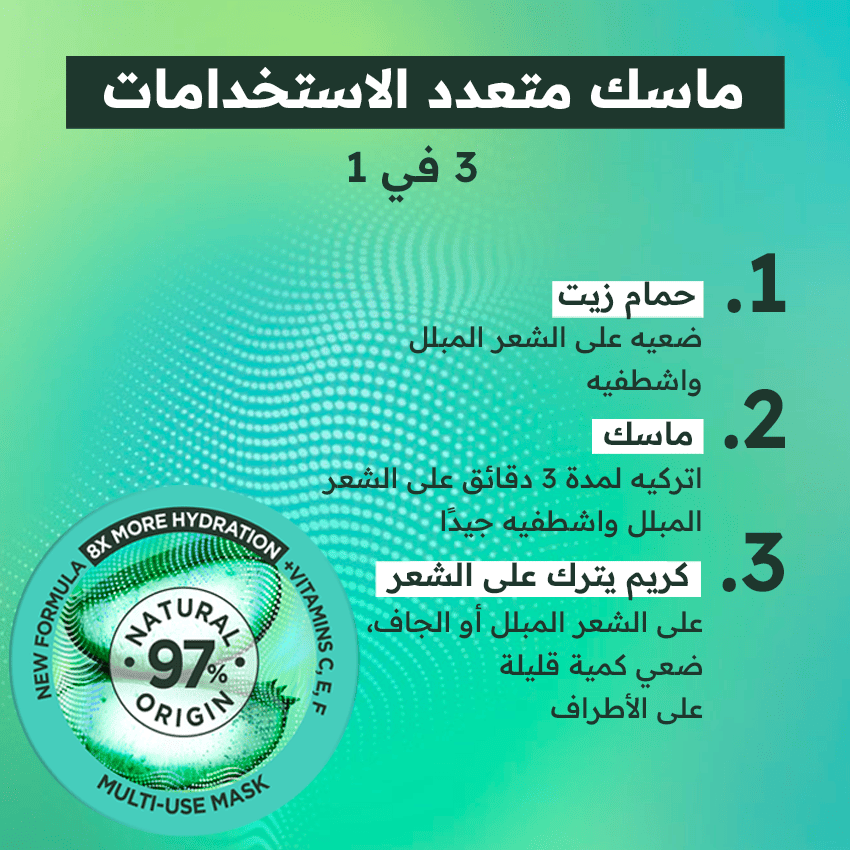 Masque : appliquer sur les cheveux mouillés, laisser agir 3 minutes et rincer abondamment.