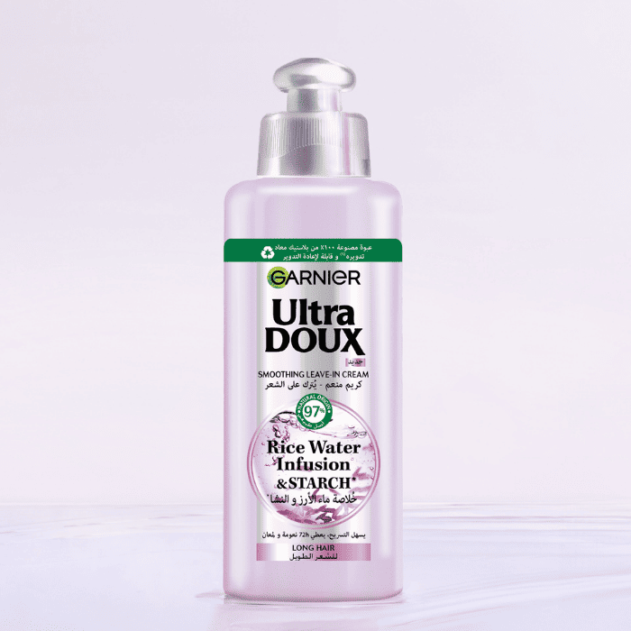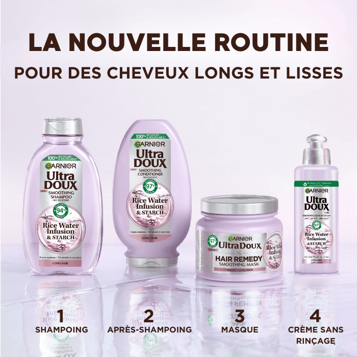 Lors de sa croissance, le cheveu est exposé à de nombreuses agressions environnementales qui endommagent la fibre. La couche protectrice du cheveu, appelée cuticule, s’ouvre et rend le cheveu terne et rêche. Notre nouveau soin Garnier Ultra Doux cheveux longs enrichi en Eau de Riz & Amidon, retient et scelle l’hydratation pour repulper instantanément le cheveu. Repulpée à l’intérieur, la fibre est lissée à l’extérieur : les cuticules sont scellées et reflètent parfaitement la lumière. Résultat : douceur et 72h de brillance*. Avec 97% d’ingrédients d’origine naturelle. Appliquer sur cheveux humides ou secs. Répartir uniformément des mi-longueurs jusqu’aux pointes. Pas besoin de rincer.