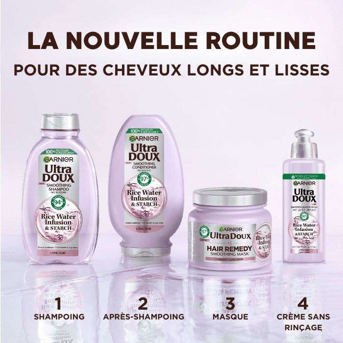 NOUVEAU ! Découvrez notre masque lissant Infusion d’Eau de Riz & Amidon pour des cheveux lisses et brillants en 1 minute.