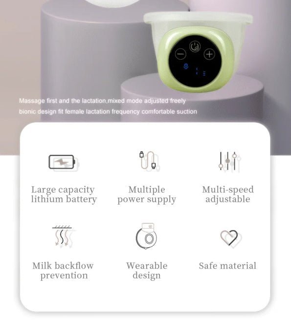 Tire-lait portable Le tire-lait mains libres peut être porté sous le soutien-gorge d’allaitement (non inclus) pour un pompage plus pratique. Avec écran LED pour afficher le mode et le niveau d’aspiration, facile à utiliser pour chaque mère novice.