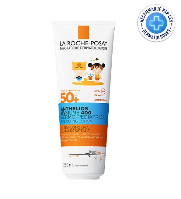 Efficacité cliniquement prouvée, formule testée sous contrôle dermatologique et pédiatrique : allégée en filtres chimiques :