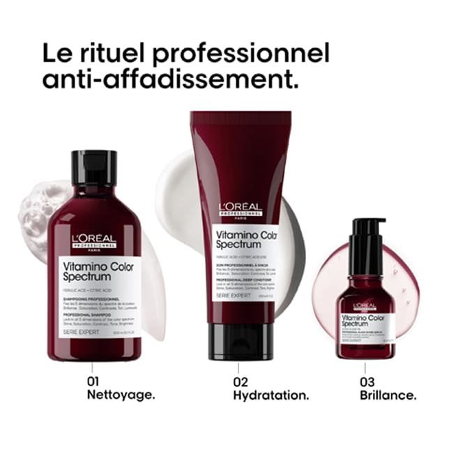 Le SÉRUM CONCENTRÉ BRILLANCE MIROIR VITAMINO COLOR SPECTRUM est bien plus qu’un simple produit de coiffage. C’est un véritable soin protecteur pour vos cheveux colorés. L’Alpha-Silane, activé par la chaleur, forme un film léger et imperceptible qui scelle la cuticule, protégeant ainsi les pigments colorés des agressions extérieures et de l’affadissement dû aux lavages. Vos cheveux sont non seulement incroyablement brillants, mais aussi plus lisses, plus doux et visiblement plus sains. Sa texture légère ne graisse pas et neText-to-speech output for the word « alourdit » (French) is not available. However, here’s a phonetic transcription: /a.luʁ.di/. vos cheveux, vous permettant de créer des coiffures sophistiquées ou de simplement sublimer votre couleur naturelle avec un éclat professionnel.