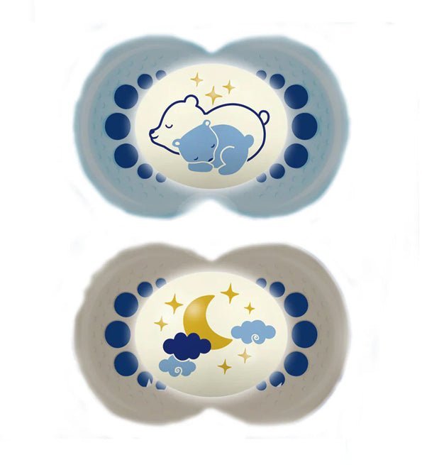 Notre sucette MAM Original Nuit existe dans de nombreuses collections et brille dans le noir pour la retrouver facilement.