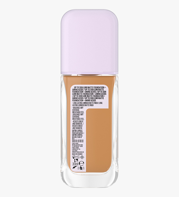 Fond de teint Superstay 30h Lumi-Matte: haute résistance, léger comme l’air. Formule enrichie en acides aminés, confortable sur la peau et qui résiste à la chaleur, la transpiration, l’eau et au transfert. Sa formule lumi matte matifie votre teint tout en gardant un aspect lumineux: terminé l’effet plâtre et le teint terne. Disponible en 27 teintes qui flattent toutes les carnations. Formule vegan. Non comédogène. Testé dermatologiquement. Convient à tous les types de peau, même aux peaux sensibles.