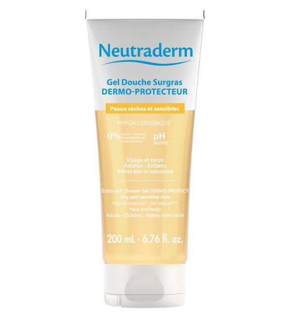 Neutraderm Gel Douche Surgras Dermo-Protecteur 200 ml à la formule fluide et douce, est recommandé pour laver en douceur les peaux sensibles et fragiles de toute la famille.
