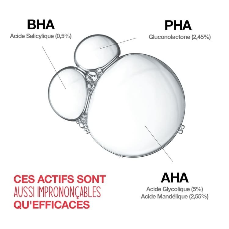 Anti-marques : Il est enrichi d’un mélange d’AHA/PHA qui aide à atténuer les marques causées par les boutons et du gluconolactone restructurant qui affine le grain de peau
