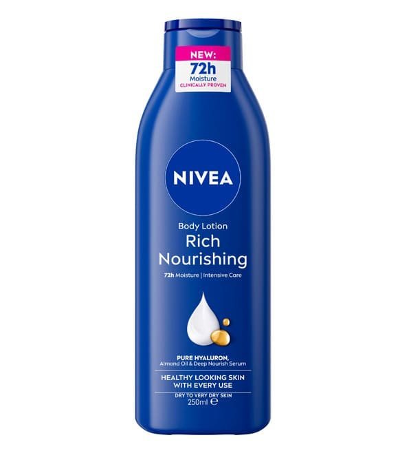 Transformez votre peau sèche avec la lotion corporelle nourrissante riche NIVEA, dotée d’une nouvelle formule améliorée qui hydrate pendant 72 heures, comme il a été cliniquement prouvé, pour une peau d’apparence saine à chaque utilisation.