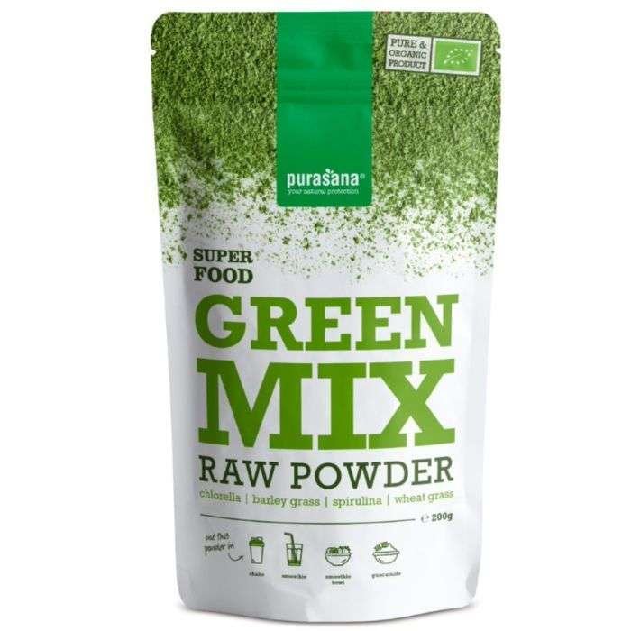 Green mix est un mélange de chlorella, de spiruline, d’herbe de blé et d’herbe d’orge. Ce mélange est naturellement riche en acide folique, en sélénium et en fer et est facilement absorbé par le corps. En mélangeant le Purasana Green Mix avec un smoothie ou un yaourt, vous absorberez facilement les éléments nutritifs importants que contiennent ces algues et ces herbes.