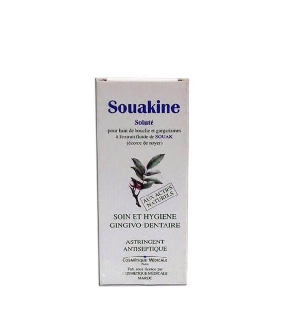 L’écorce séchée de jeunes rameaux de noyer appelé « SOUAK » est utilisée depuis des millénaires comme stimulateur gingivo-dentaire ayant la qualité de libérer des composants trés efficaces pour l’hygiène et le soin bucco-dentaire tels que: tanins, juglone et complexe vitaminique. Le BAIN DE BOUCHE SOUAKINE tonifie et renforce les gencives sensibles, combat la fragilité ginvivo-dentaire et purifie l’haleine.