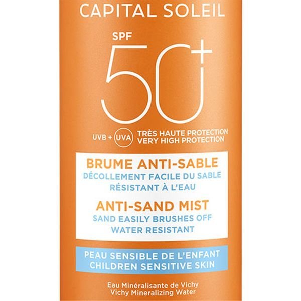 La brume solaire anti-sable Vichy Capital Soleil SPF 50+ protège efficacement du soleil la peau sensible des enfants. Elle est indiquée pour les activités sur la plage grâce à sa technologie anti-sable et anti-irritation qui facilite le décollement du sable sur la peau sans douleur.