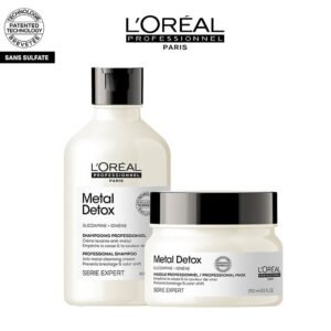 د.م.660 Le prix initial Ă©tait : د.م.660.د.م.599Le prix actuel est : د.م.599.Shampoing DĂ©tox MĂ©tal :Nettoie les cheveux en Ă©liminant les particules mĂ©talliques emprisonnĂ©es Ă l’intĂ©rieur de la fibre.Laisse les cheveux radieux, plus doux et plus sains tout en protĂ©geant l’éclat de la couleur des cheveux. Masque dĂ©tox mĂ©tal : Un traitement en profondeur qui nourrit et hydrate les cheveux, en conservant leur force et leur brillance….